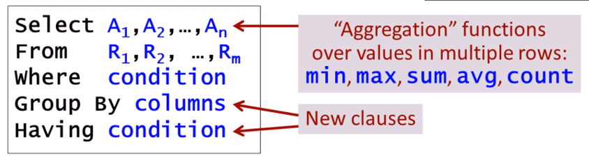 Aggregate functions perform computations over rows of a relation. Along with aggregation function two new clauses can be used: GROUP BY and HAVING. GROUP BY allows us to partition rows in groups and then aggregate function can compute over each group independently. HAVING clause filters groups after they have been created by group by.